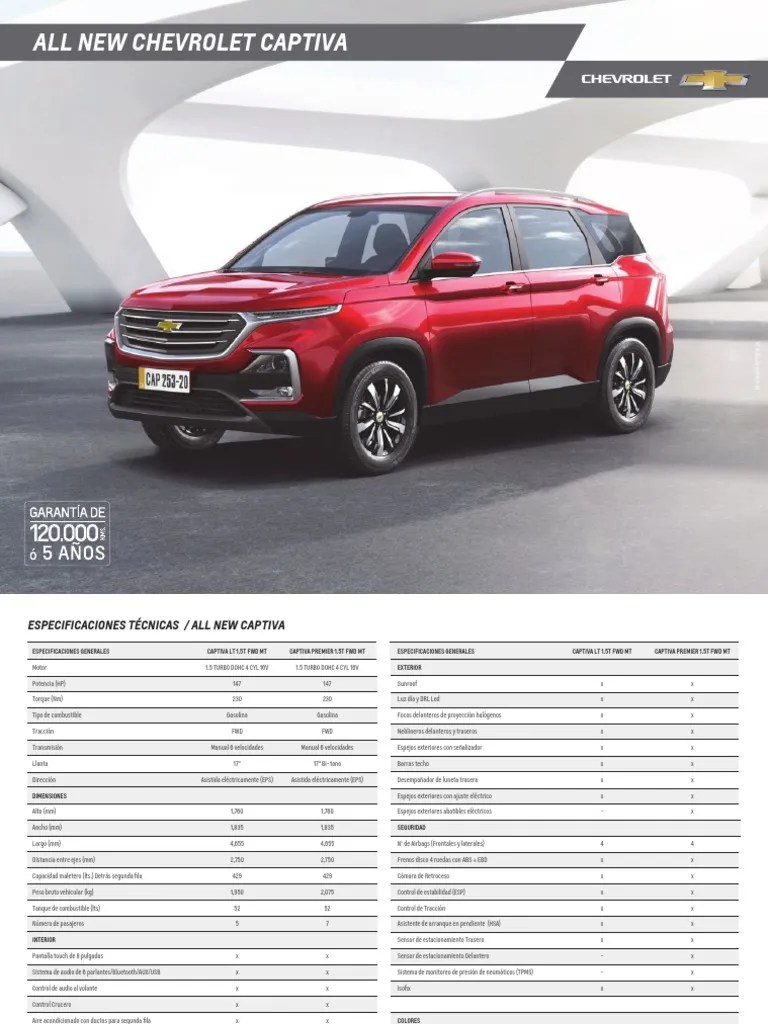 Ficha Tecnica Captiva 2021 : Equipadas con motor turbo eficiente de 1.5l y más.. Precio válido desde 01/03/2022 hasta 31/03/2022 y exclusivamente con chevrolet servicios financieros, la variación en valor uf y en plan de tasas puede aplicar, pudiendo modificar valor cuota publicado. Sujeto a análisis y aprobación de crédito por gm financial de méxico, s.a. Colores de referencia aplican dependiendo la versión. La chevrolet captiva 2022 llega en tres versiones. Descubre captiva y conoce en detalle tu próxima suv.